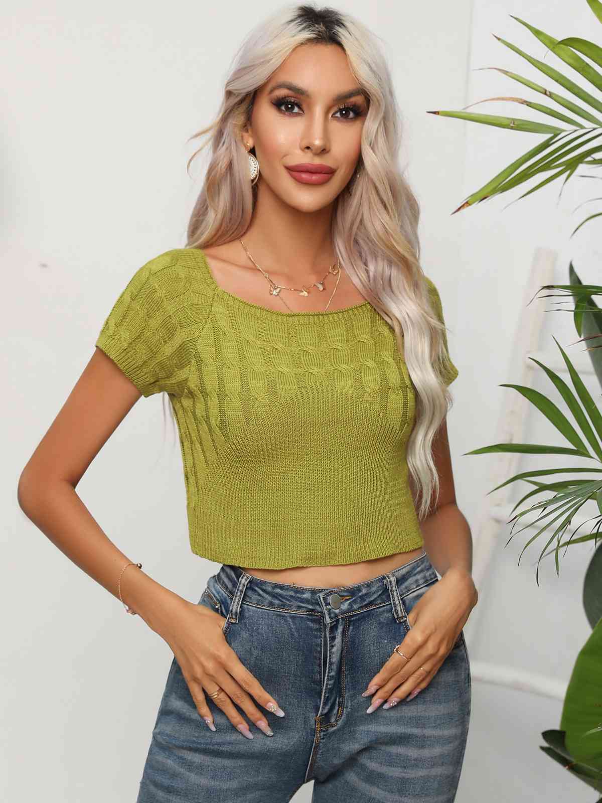 Cable-Knit Round Neck Short Sleeve Knit Top