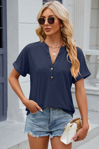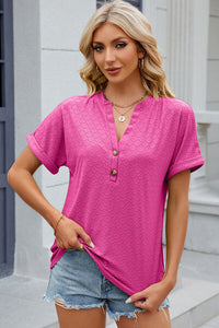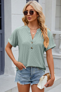 Introducing our Eyelet Notched Short Sleeve T-Shirt. Made with delicate eyelet fabric and unique notched sleeves, this shirt is both stylish and breathable. Perfect for any occasion, it offers a comfortable fit and a touch of elegance to your wardrobe. Upgrade your look today.