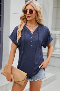 Half Button Drawstring Short Sleeve Hooded T-Shirt