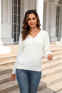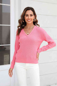 Ribbed V-Neck Dropped Shoulder Knit Top