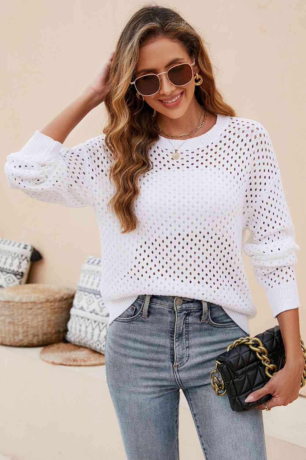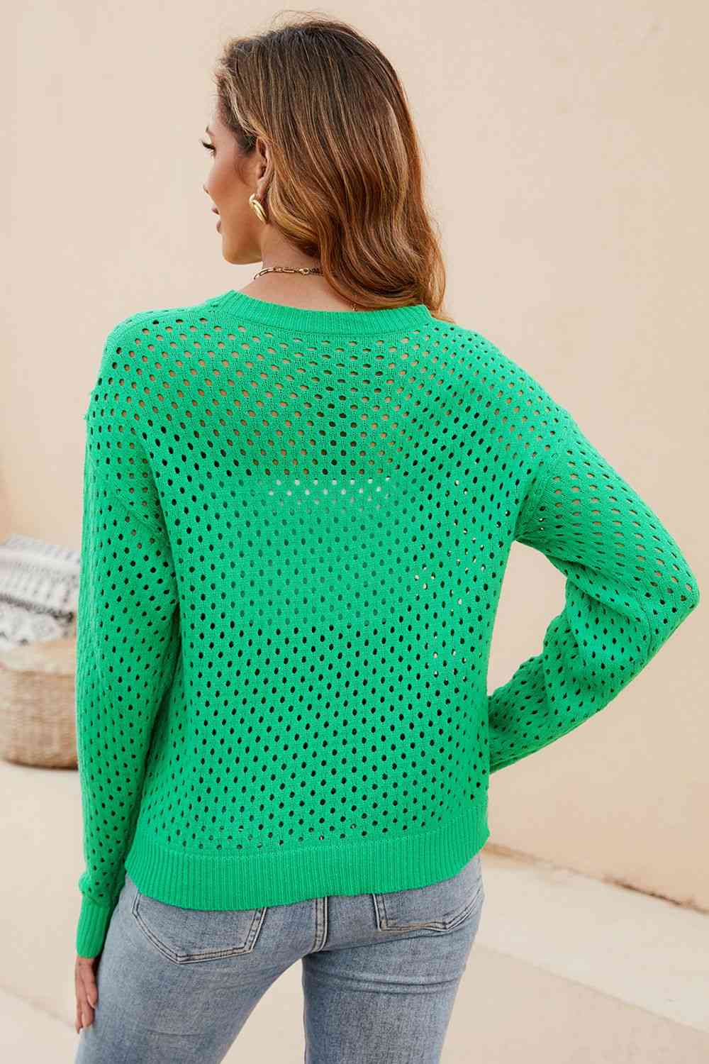 Round Neck Openwork Dropped Shoulder Knit Top