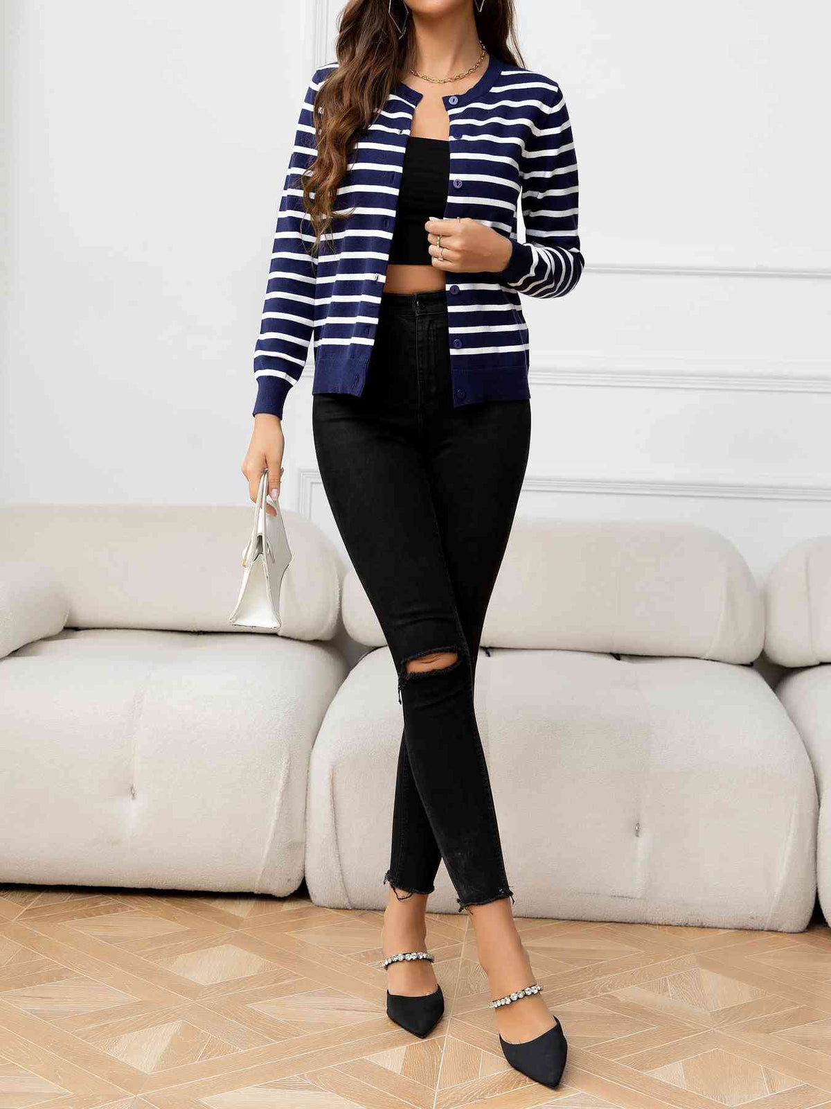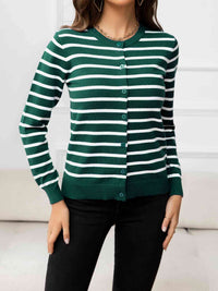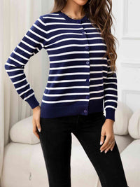 Striped Round Neck Long Sleeve Buttoned Knit Top
