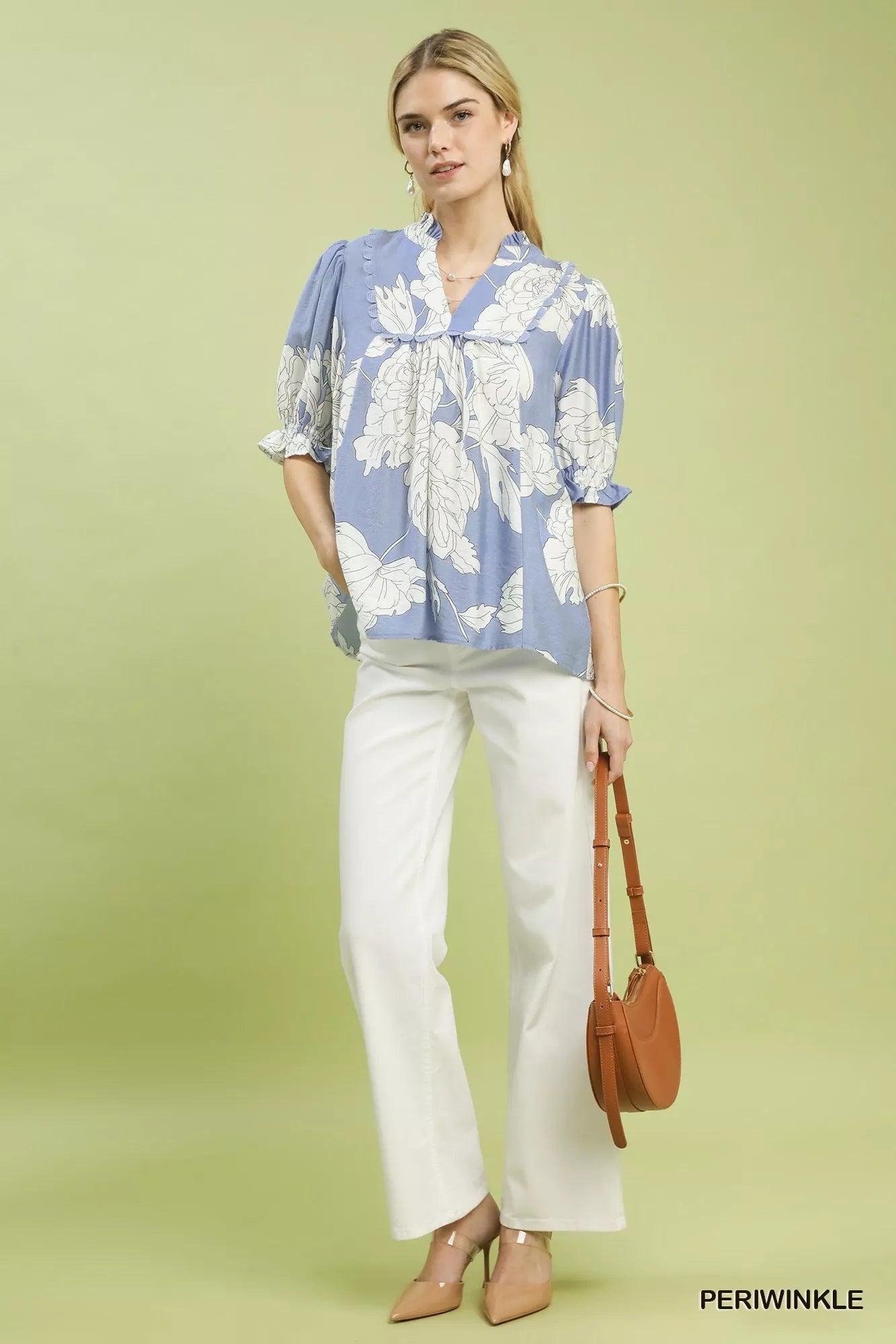 Introducing the charming Peony Illustration Print Top, a must-have for your wardrobe. This top features a trendy split V-neck design that adds a modern touch to the overall look. The short puff sleeves and scalloped trim offer a unique and feminine aesthetic. Complete with a ruffle hem for added flair, this top is perfect for adding a touch of whimsy to your outfit. Please note that this top is not lined, providing a breathable and lightweight feel that is ideal for warmer days. Elevate your style with this delightful and versatile piece.