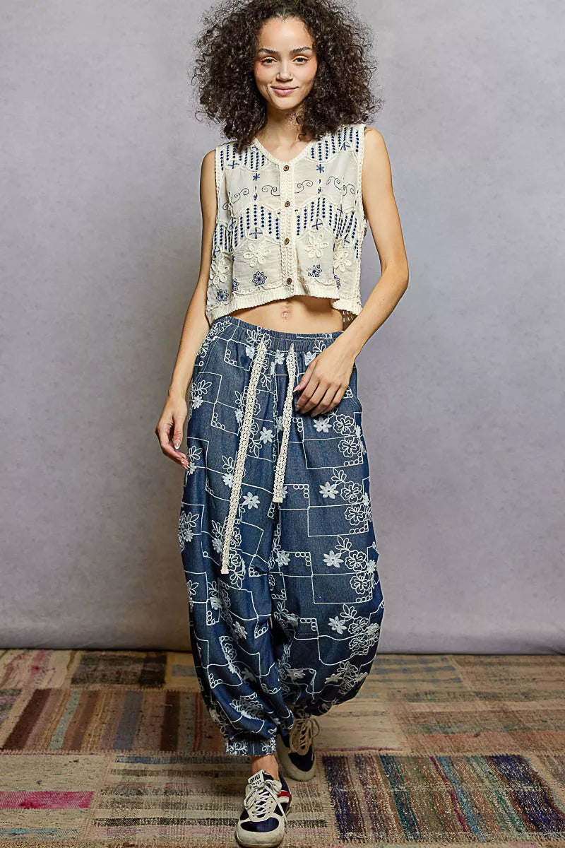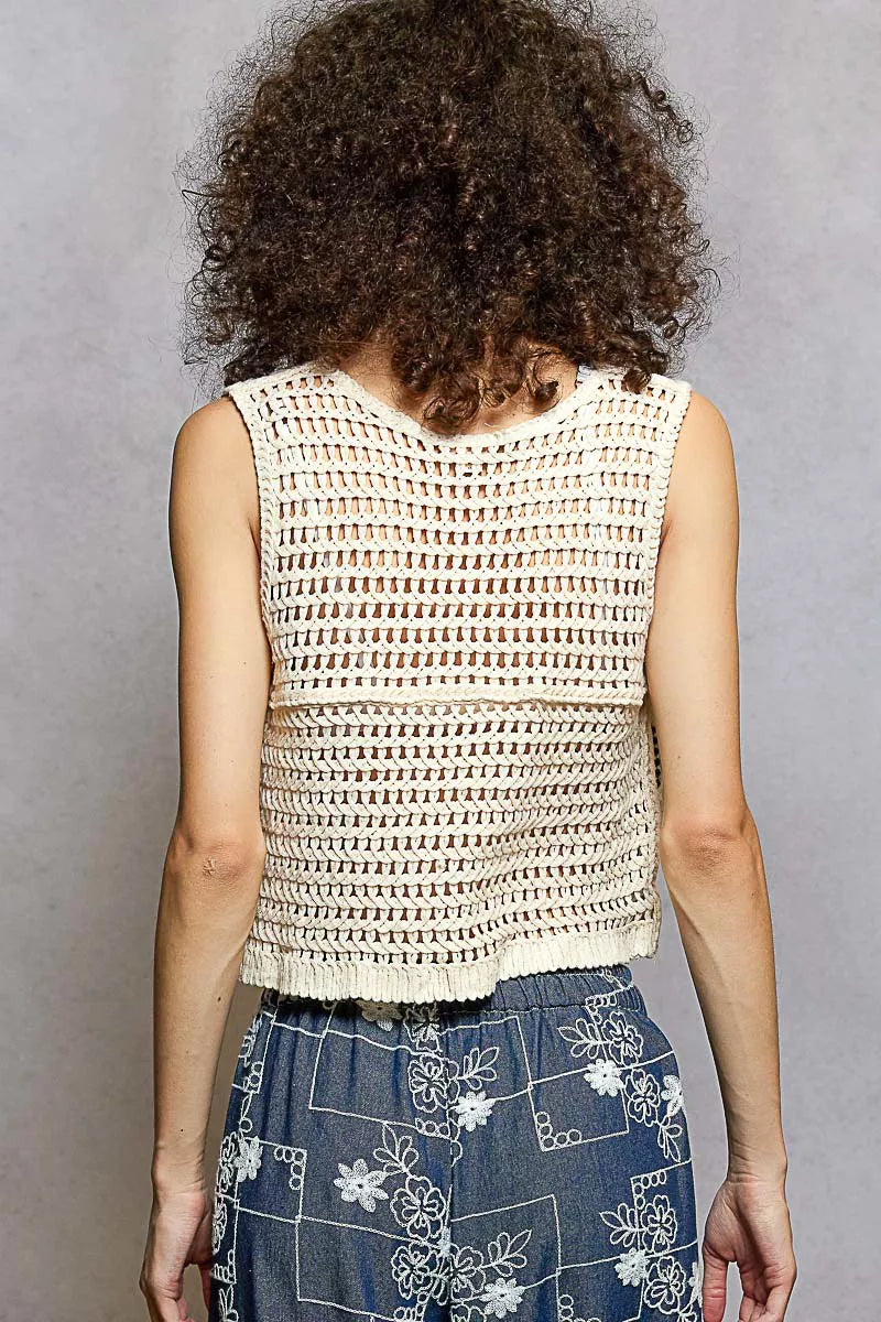 POL Embroidered Floral Cropped Crochet Vest