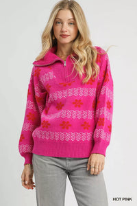 Umgee Floral Patterned Jacquard Quarter-Zip Pullover Sweater