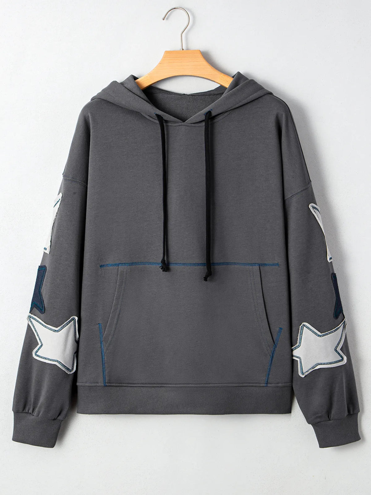 Star Patchwork Contrast Stitching Mineral Wash Kangaroo Pocket Hoodie