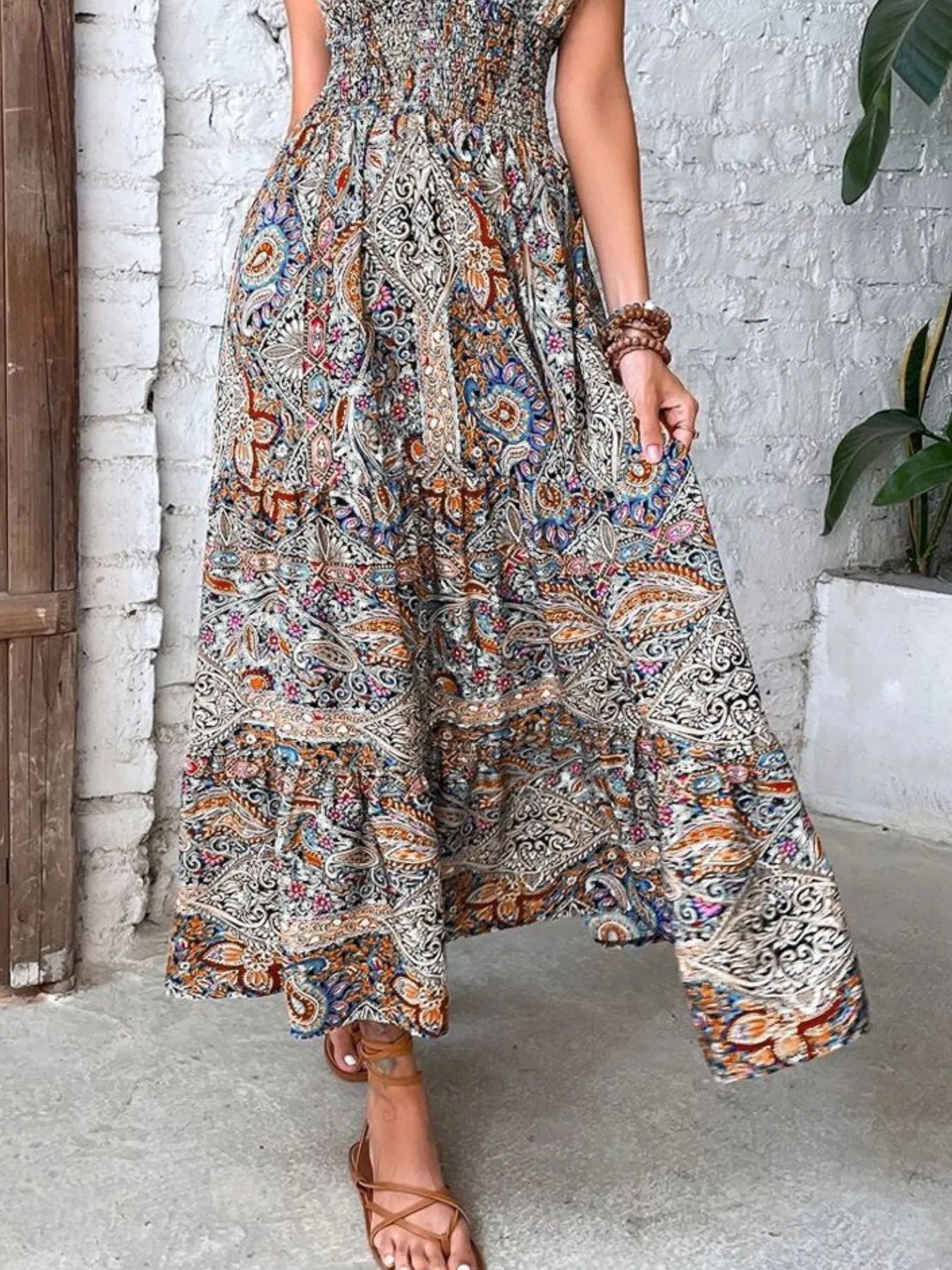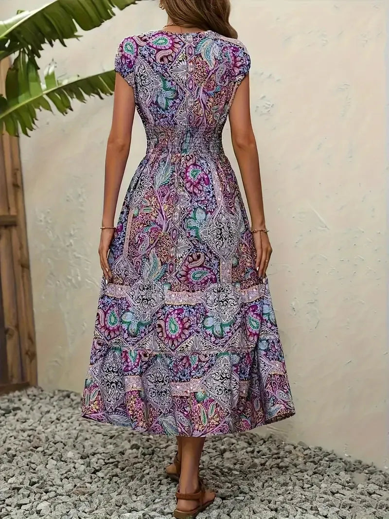 Plus Size Printed V-Neck Short Sleeve Midi Dress