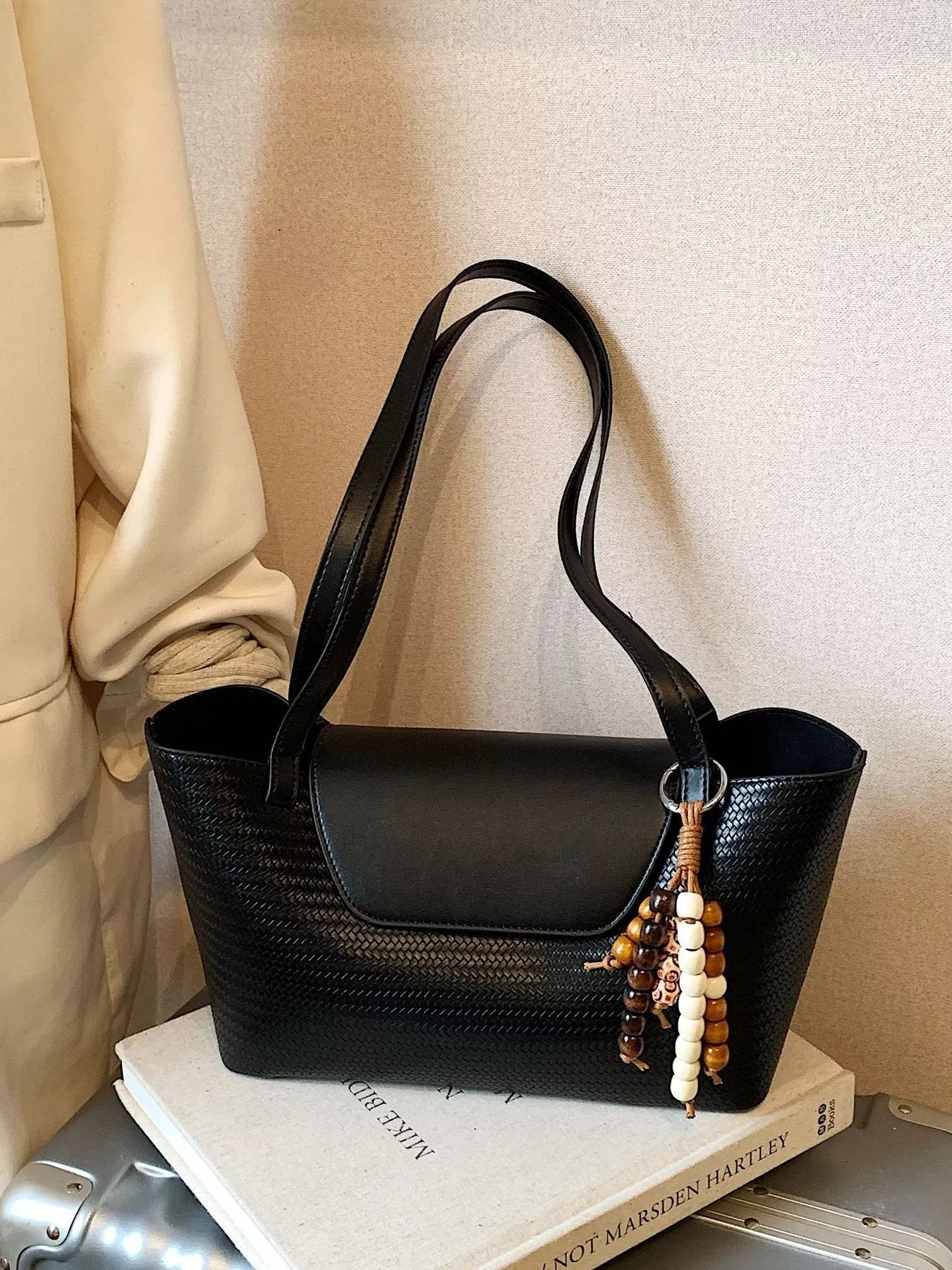 Texture Tote Bag with Beaded Charm
