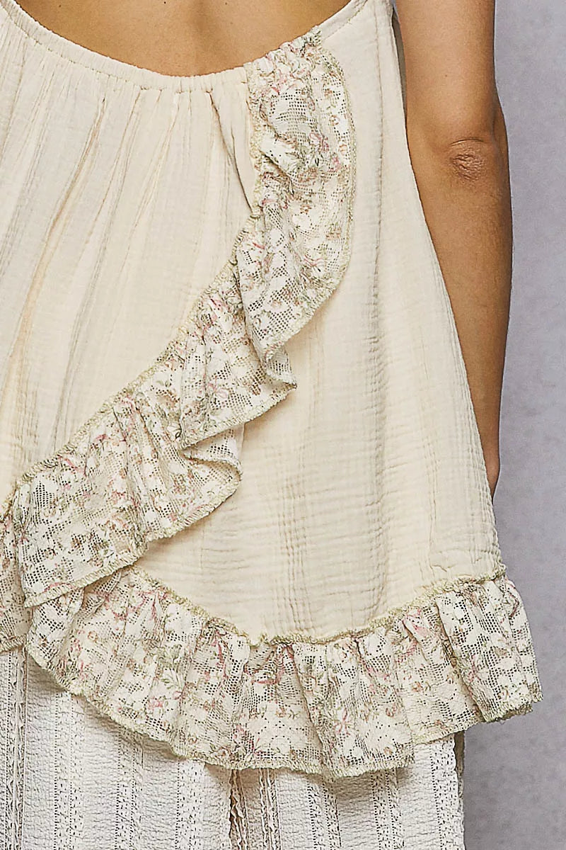 POL Lace Ruffle Halter Neck Double Gauze Top with Crochet Patch